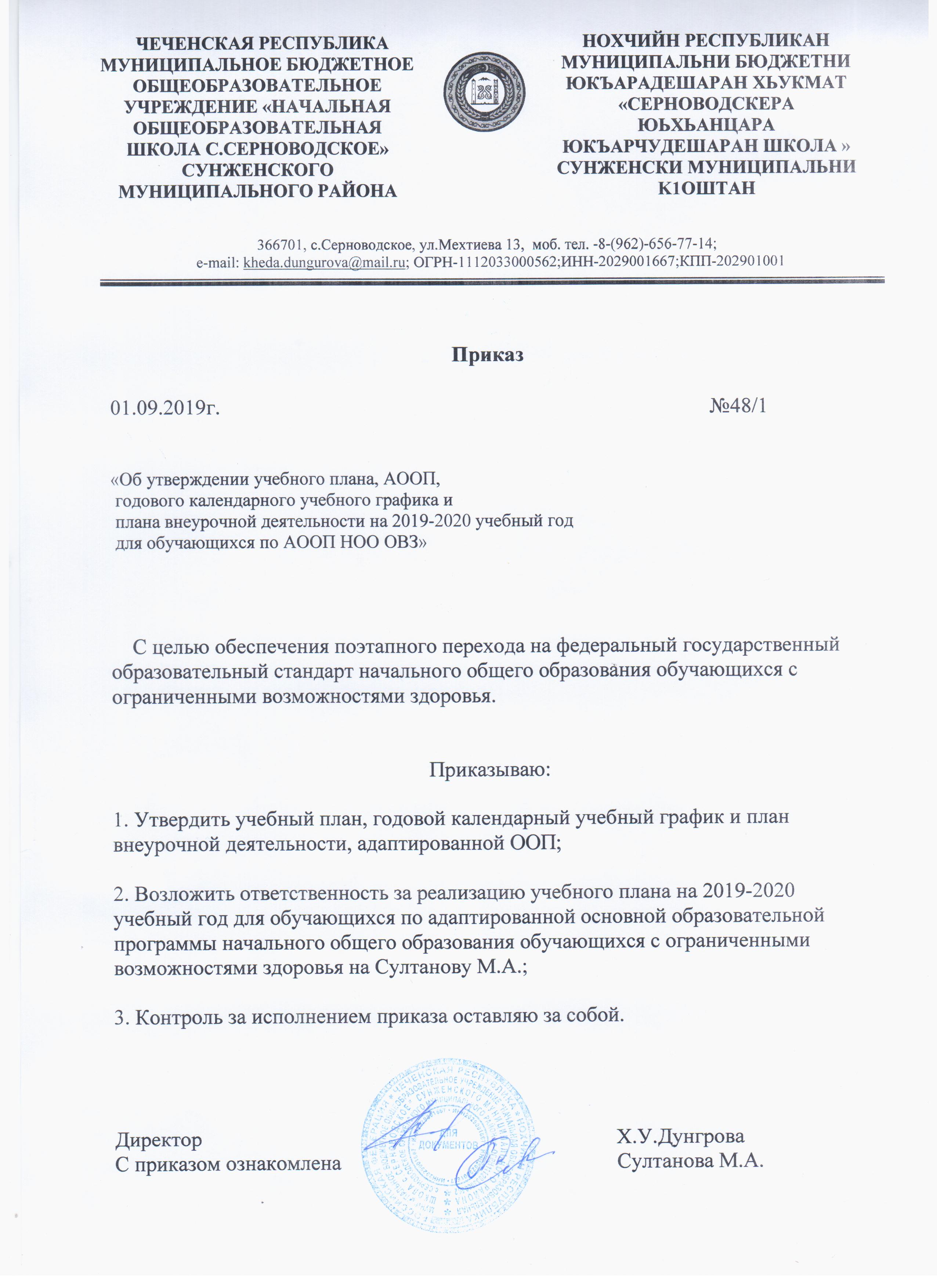 Приказ об утверждении учебного плана, АООП, годовогот календарного учебного графика и плана внеурочной деятельности на 2019-2020 учебный год для обучающихся по АООП НОО ОВЗ