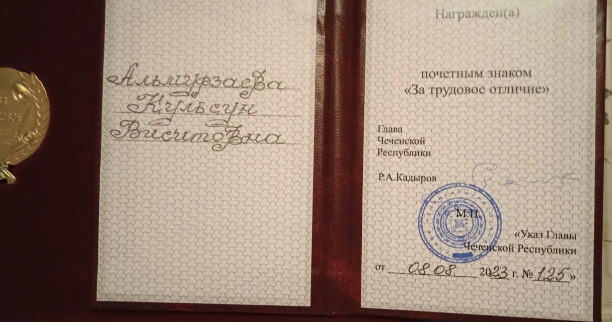 Почетным знаком "За трудовое отличие" отмечена Альмурзаева Кульсун Виситовна, учитель начальных классов МБОУ "НОШ с.Серноводское"