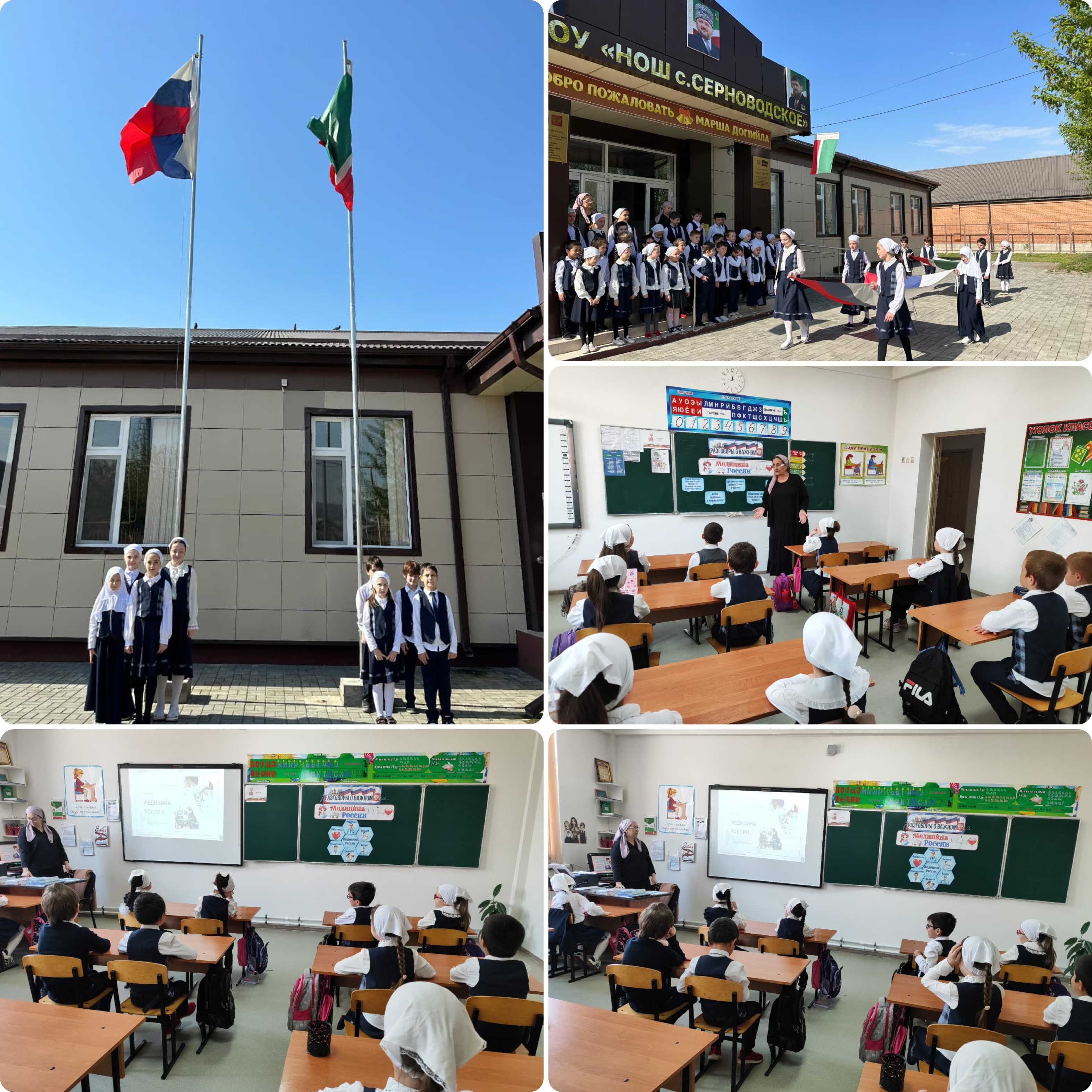 Утро понедельника в школе традиционно началось с торжественной линейки, церемонии выноса флагов РФ, ЧР и исполнения гимна Российской Федерации и гимна Чеченской Республики.